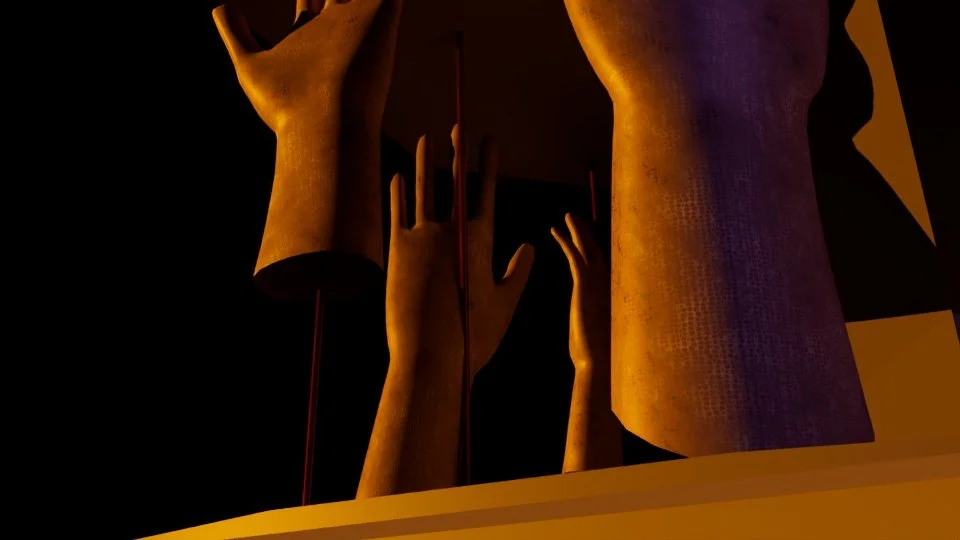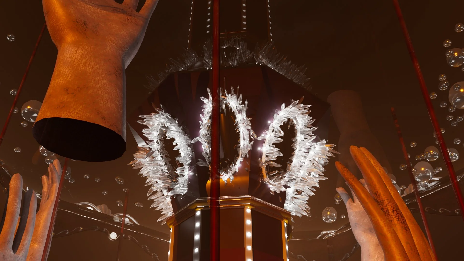 A carefully constructed vintage carousel sits in a hazy desert. Hands on the platform slowly rise and fall. Surrounded by playful noise and the ringing of a starting bell, it may awaken at any moment.